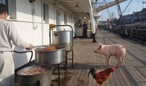 Kayu had nog gedacht: “Als het met kippen lukt dan kan ’n biggetje ook wel” Maar de Baas vergat één ding, namelijk dat onze ouwe iedere dag ’n vers eitje van onze eigen kippen dacht te krijgen, maar die kippen hadden nog nooit één ei gelegd! Dat was de reden dat onze Scheepskok iedere dag het merkstempeltje van het Australische eitje poetste, tot volle tevredenheid van Kapitein Rennes die een aantal keren reageerde met de opmerking: “Je kan proeven dat het ’n vers eitje is!”