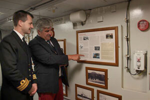 HMS Diamond Commander Ian Clarke en Ed van Lierde bij de permanente mini-expositie over de Slamatherdenking